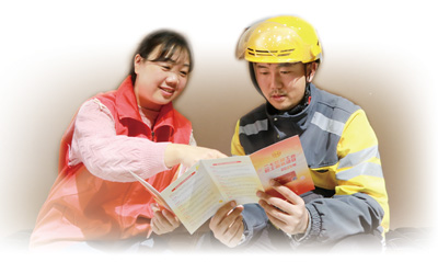 河南郑州,外卖员王光辉(右)在工会驿站了解保障政策。 蒯 靓摄