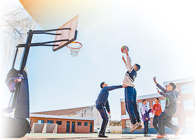 山西岚县普明希望小学,孩子们在打篮球。 马梦迪摄